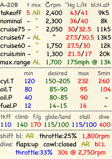 战斗(5min限制):2400 RPM,43.0/41.0 inch Hg,混合比“自动富油”
